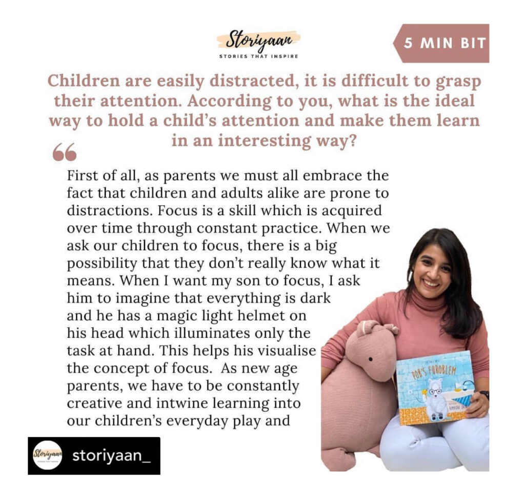 When I want my son to focus, I ask him to imagine that everything is dark and he has a magic light helmet on his head which illuminates only the task at hand. This helps his visualise the concept of focus. As new age parents, we have to be constantly creative and intwine learning into our children’s everyday play and activities.