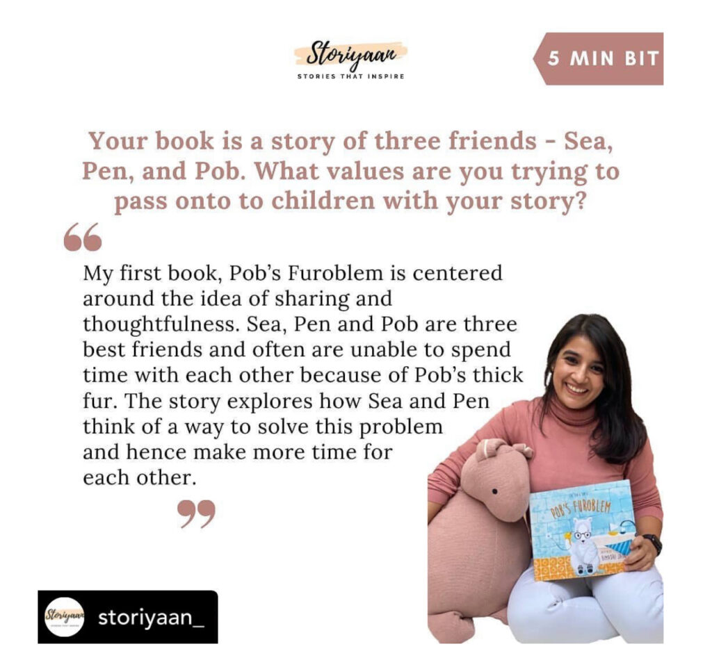 Ans. My first book, Pob’s Furoblem is centered around the idea of sharing and thoughtfulness. Sea, Pen and Pob are three best friends and often are unable to spend time with each other because of Pob’s thick fur. The story explores how Sea and Pen think of a way to solve this problem and hence make more time for each other.