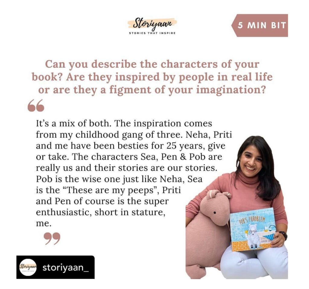 Ans. It’s a mix of both. The inspiration comes from my childhood gang of three. Neha, Priti and me have been besties for 25 years, give or take. The characters Sea, Pen & Pob are really us and their stories are our stories. Pob is the wise one just like Neha, Sea is the “These are my peeps”, Priti and Pen of course is the super enthusiastic, short in stature, me.